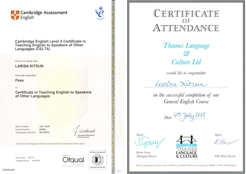 Кицун Лариса — преподаватель, репетитор (г. Минск, Беларусь). Образование высшее (диплом с отличием), магистратура, языковое обучение в Великобритании (Лондон, 2018), международный сертификат CELTA (2019 г.),